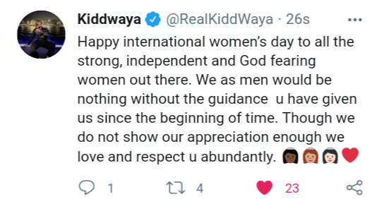 “Happy international women’s day to all the strong, independent and God fearing women out there. We as men would be nothing without the guidance u have given us since the beginning of time. Though we do not show our appreciation enough we love and respect u abundantly.”