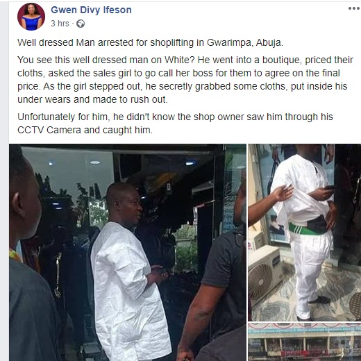 You see this well dressed man on White? He went into a boutique, priced their cloths, asked the sales girl to go call her boss for them to agree on the final price. As the girl stepped out, he secretly grabbed some cloths, put inside his under wears and made to rush out.