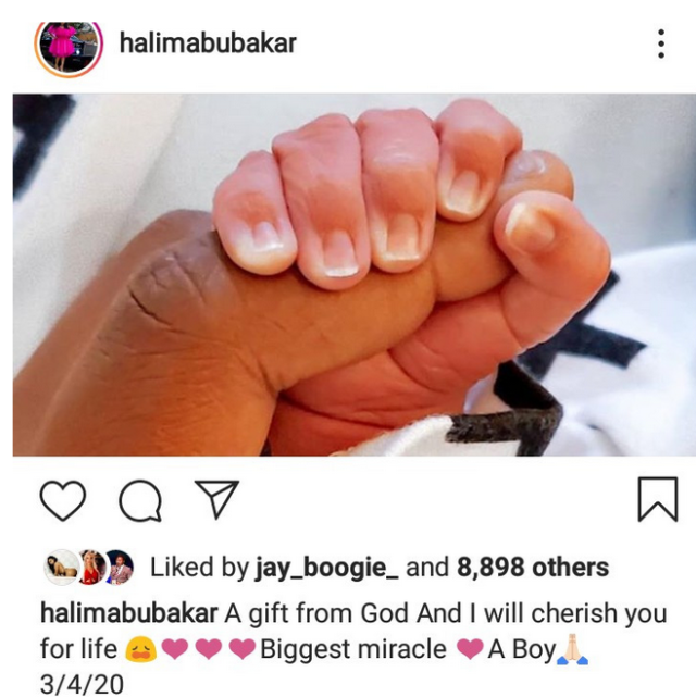 Halima Abubakar, who some years beat complications from a fibroid operation recently took to her Instagram page to reveal she had welcomed her bundle of joy on April 3,2020.