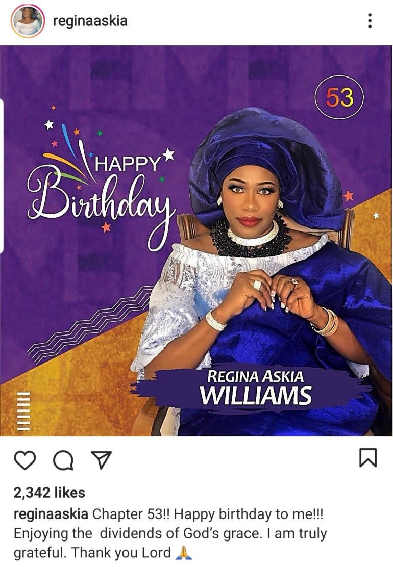 Popular Nollywood actress, Regina Askia is marking her 53rd birthday today, the 16th day in December 2020 with beautiful photoshoots.