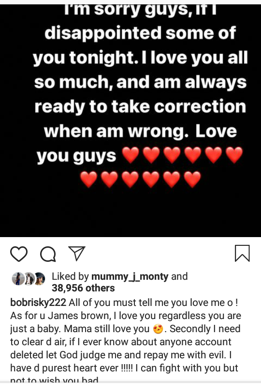 “All of you must tell me you love me o ! As for u James brown, I love you regardless you are just a baby. Mama still love you 😍. Secondly I need to clear d air, if I ever know about anyone account deleted let God judge me and repay me with evil. I have d purest heart ever !!!!! I can fight with you but not to wish you bad.”