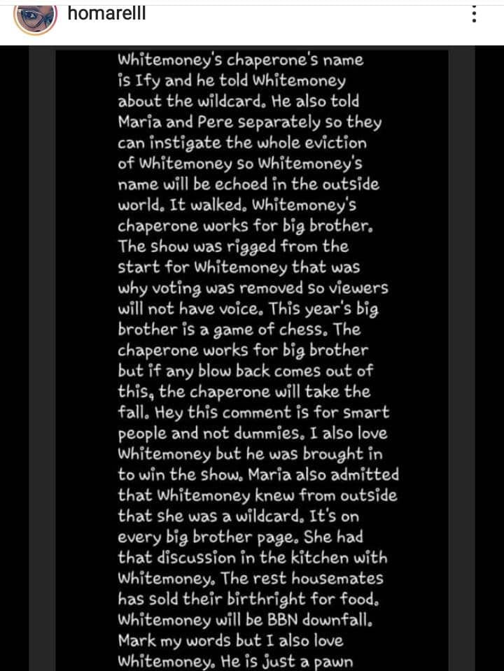 “Whitemoney’s chaperone’s name 7s Ify and he told Whitemoney about the wildcard. He also told Maria and Pere separately so they can instigate the whole eviction of Whitemoney so Whitemoney’s name will be echoed in the outside world, It walked, whitemoney’s chaperone works for big brother.