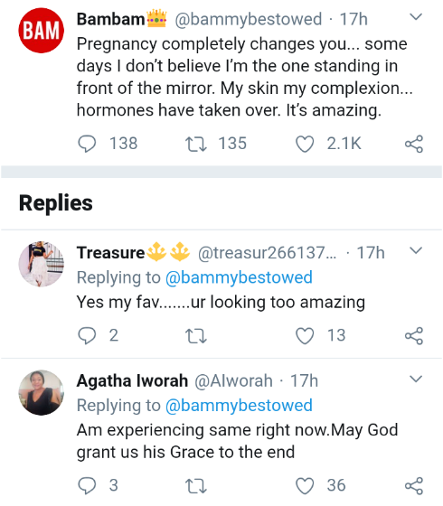 Former Big Brother Naija housemate, BamBam took to her Twitter page to open up on her experience on pregnancy.