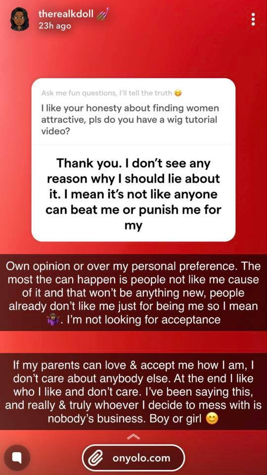 As expected, mixed reactions trailed Kiku’s disclosure and she went on to affirm that her parents know about her sexuality and have also accepted her the way she is. She added that the least people can do is hate her even though whoever she decides to “mess with” both boy or girl, is nobody’s business.