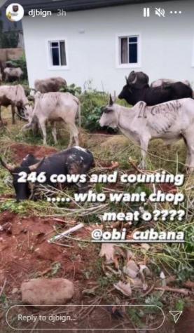 Nigerian DJ, BigN has further disclosed that so far 246 cows have been received from friends and associates for Cubana’s mother’s burial.