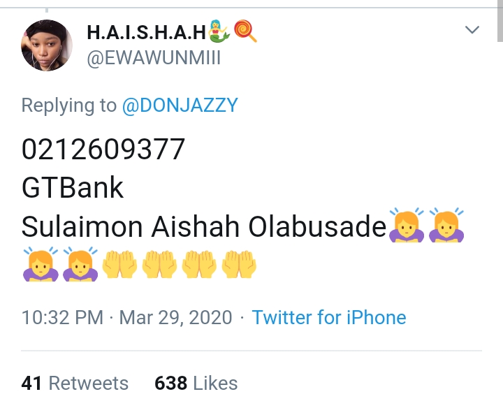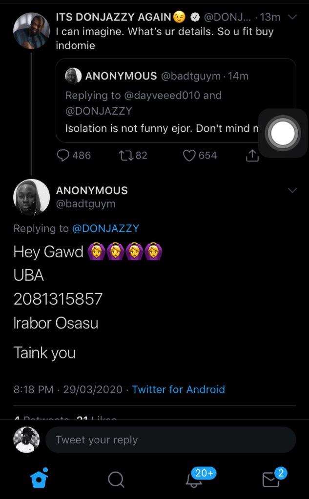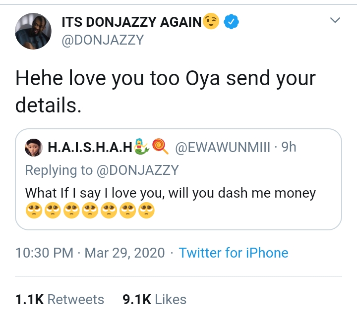 Meanwhile, Don Jazzy did another 100k giveaway after sending money to the guy. He sent to a lady, @EWAWUNMIII, who said to him:
