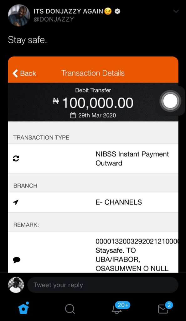 The guy who had told the producer to keep quiet before, suddenly wanted him to make the loudest noise as he dropped his account details and Don Jazzy sent him a N100,000.