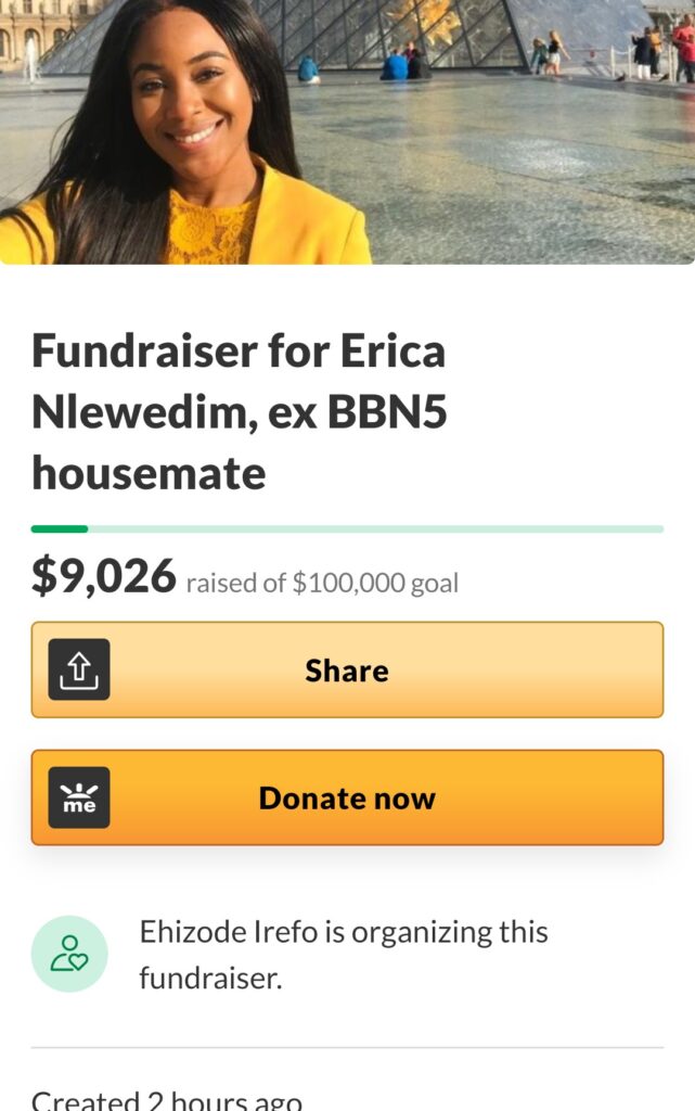 Well Erica’s team, also opened a Gofundme account, so her fans can contribute some cash for her, And in just 1hr, they were able to donate over 2Million Naira, we later checked back, and it turns out they’re already at 4Million naira in 2hrs, that’s about $10,000, their target is $100,000