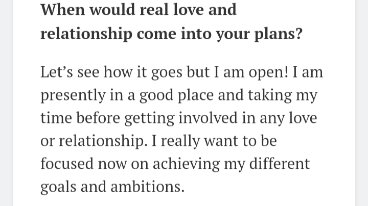 Let’s see how it goes but I am open! I am presently in a good place and taking my time before getting involved in any love or relationship. I really want to be focused now on achieving my different goals and ambitions.