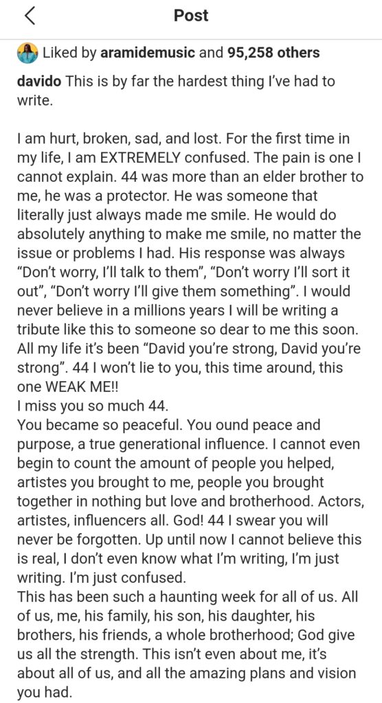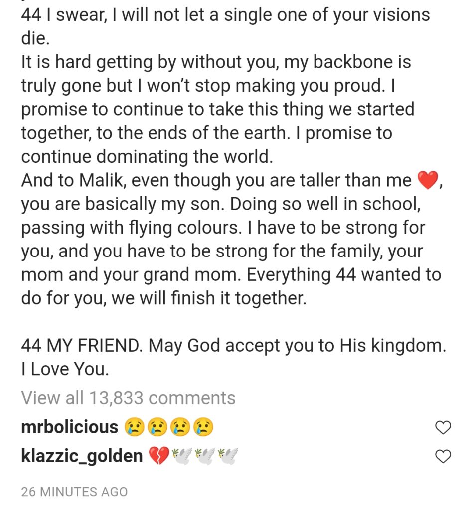 You became so peaceful. You ound peace and purpose, a true generational influence. I cannot even begin to count the amount of people you helped, artistes you brought to me, people you brought together in nothing but love and brotherhood. Actors, artistes, influencers all. God! 44 I swear you will never be forgotten. Up until now I cannot believe this is real, I don’t even know what I’m writing, I’m just writing. I’m just confused.