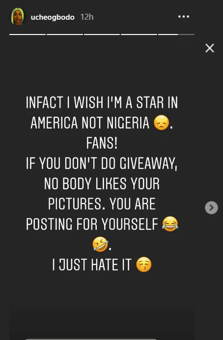 “Infact I wish I’m a star in America not Nigeria. Fans! If you don’t do giveaway, nobody likes your pictures. You are posting for yourself. I just hate it.”she wrote.