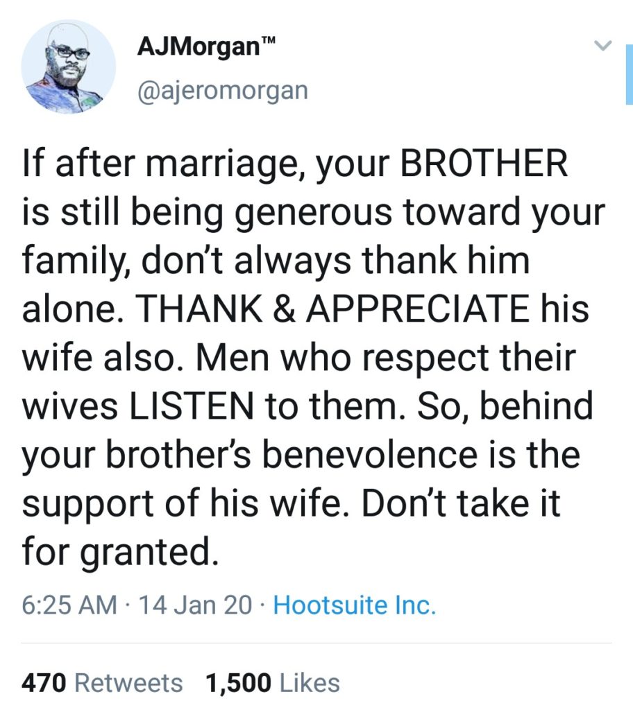 “If after marriage, your BROTHER is still being generous toward your family, don’t always thank him alone. THANK & APPRECIATE his wife also. Men who respect their wives LISTEN to them. So, behind your brother’s benevolence is the support of his wife. Don’t take it for granted.”