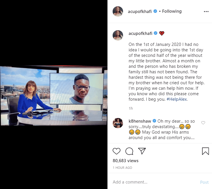 “On the 1st of January 2020 I had no idea I would be going into the 1st day of the second half of the year without my little brother. Almost a month on and the person who has broken my family still has not been found. The hardest thing was not being there for my brother when he cried out for help. I’m praying we can help him now. If you know who did this please come forward. I beg you. #HelpAlex.” she wrote on Instagram.
