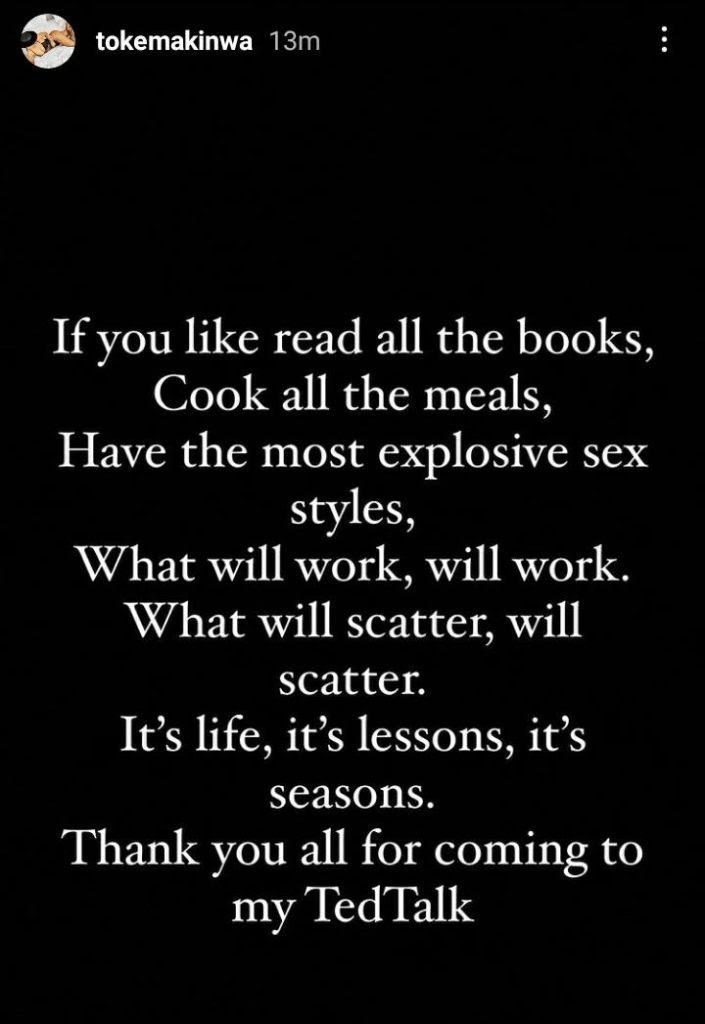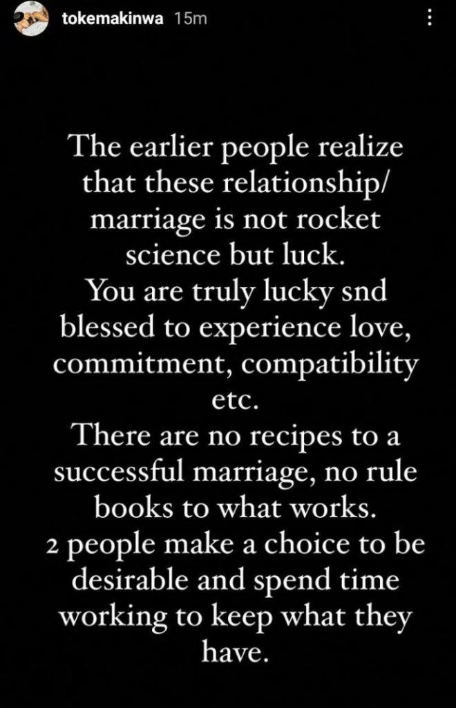 Toke Makinwa made this known in an Instastory post where she wrote;