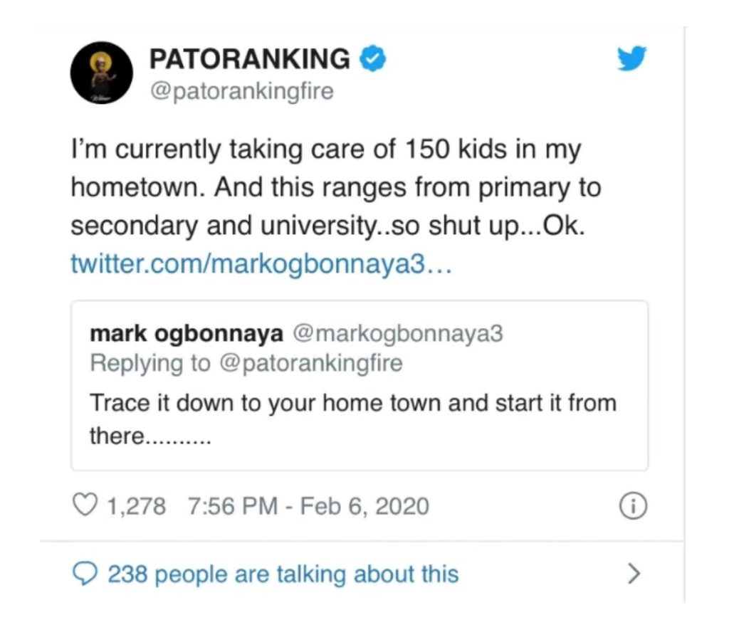 Patrick Nnaemeka Okorie, better known by his stage name Patoranking recently got into an argument with a troll on Twitter, who challenged him to extend his charitable acts to his roots.