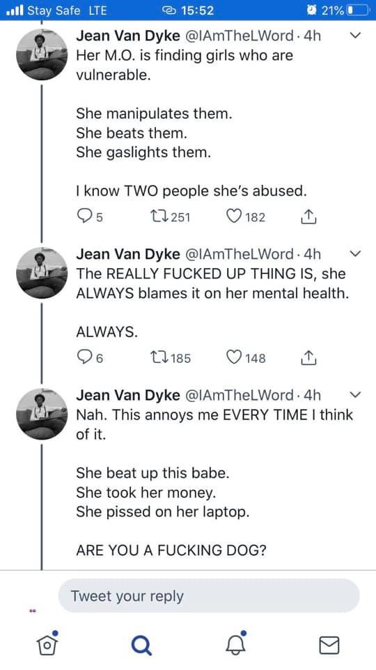 Twitter user, @3D_Hottie was accused of preying on girls who are vulnerable, beating her partners, manipulating her partners, taking their money and “pissing on their laptop” at the slightest provocation.