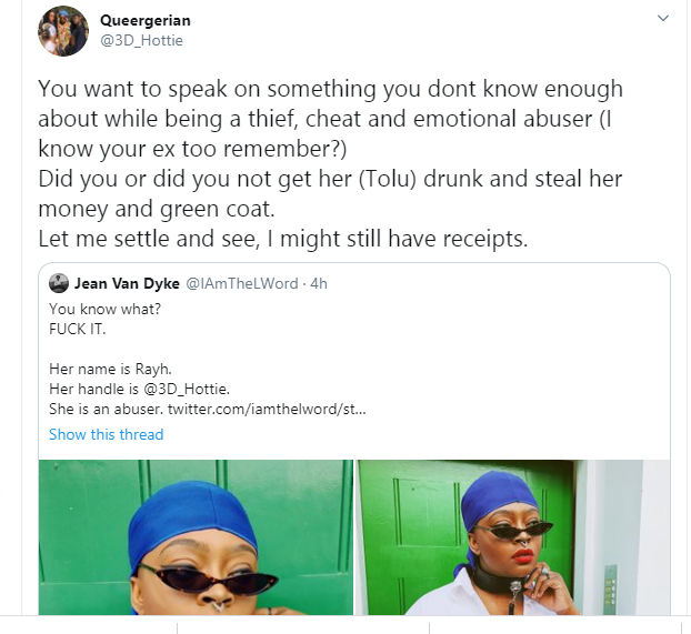 A Nigerian lesbian feminist who is UK-based has resorted to defending herself after she was outed on Twitter for allegedly abusing her partner and others in the past.