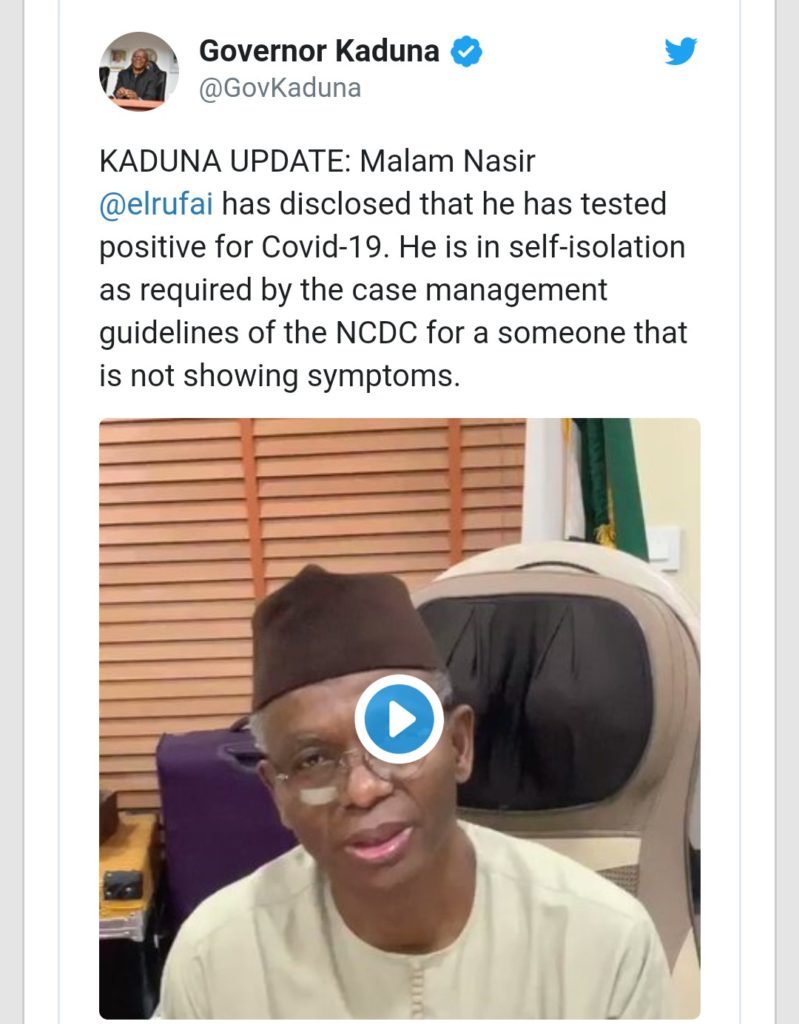Governor of Kaduna State, Mallam Nasir El-Rufai has tested positive for the dreaded novel COVID-19.