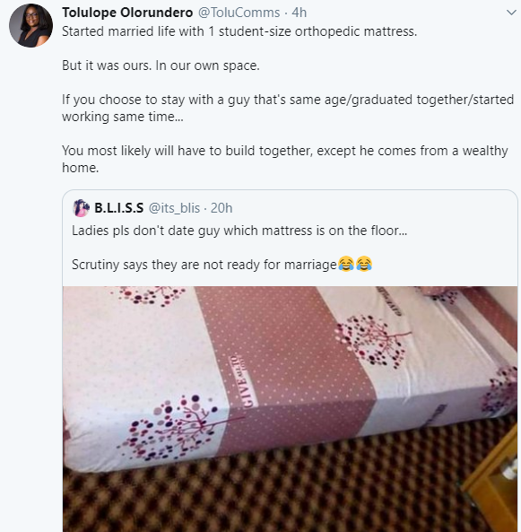 She wrote: >“Started married life with 1 student-size orthopedic mattress. But it was ours. In our own space. If you choose to stay with a guy that’s same age/graduated together/started working same time… You most likely will have to build together, except he comes from a wealthy home.”