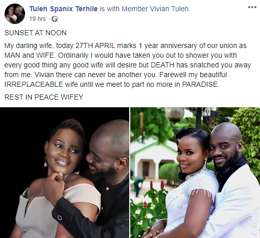 A Nigerian man, Tuleh Spanix Terhile, has been thrown into mourning after his wife, Vivian, died on Monday April 27.