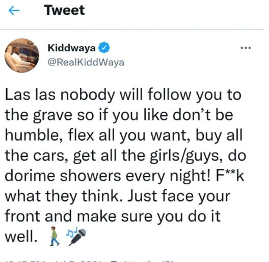 “Las las nobody will follow you to the grave so if you like don’t be humble, flex all you want, buy all the cars, get all the girls/guys, do dorime showers every night! F**k what they think. Just face your front and make sure you do it well.”