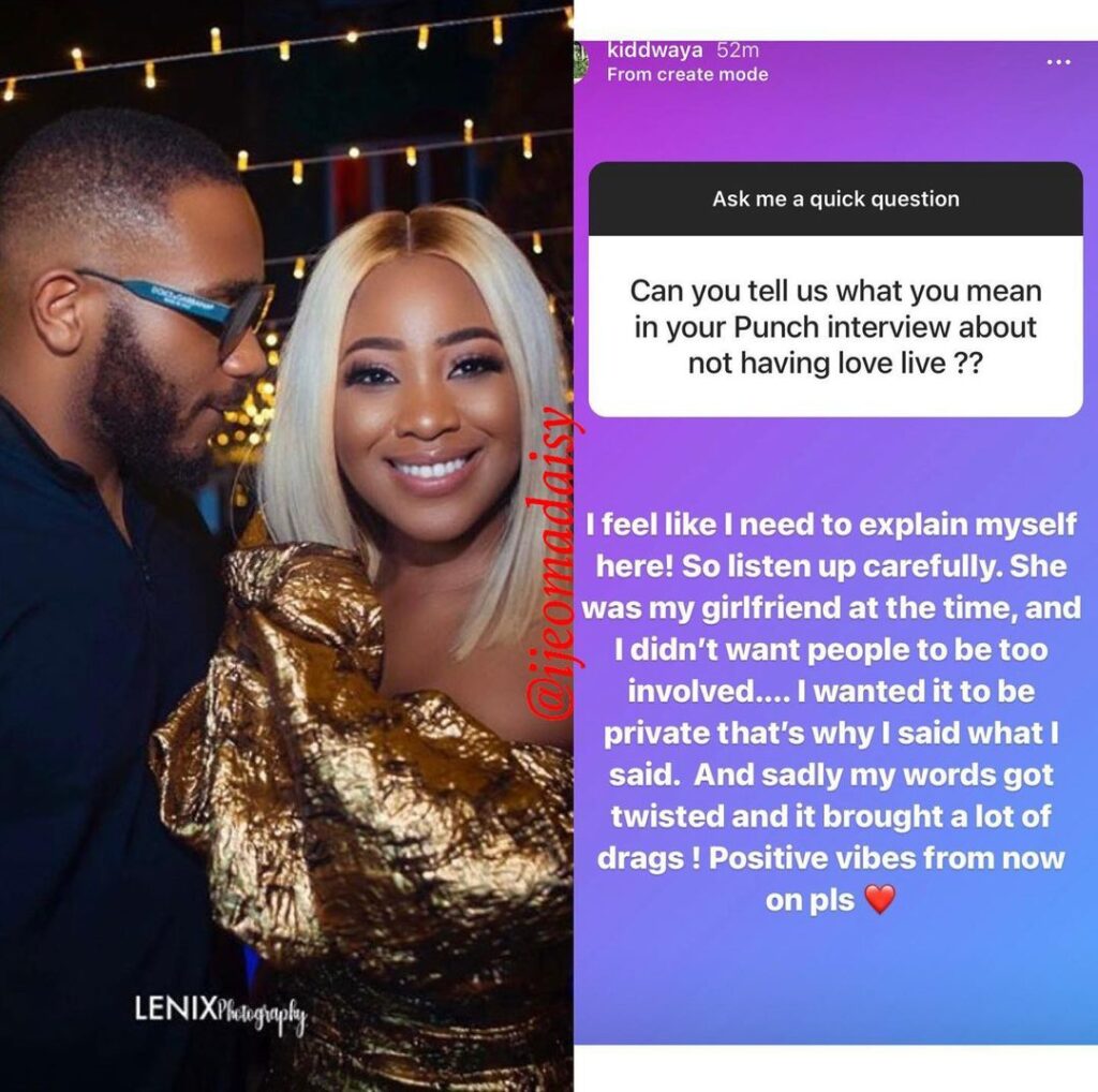 Earlier today, during a question and answer with his fans, Kiddwaya too his time to explain to a Fan, that he and Erica are no longer together, and would love the fans to respect that!