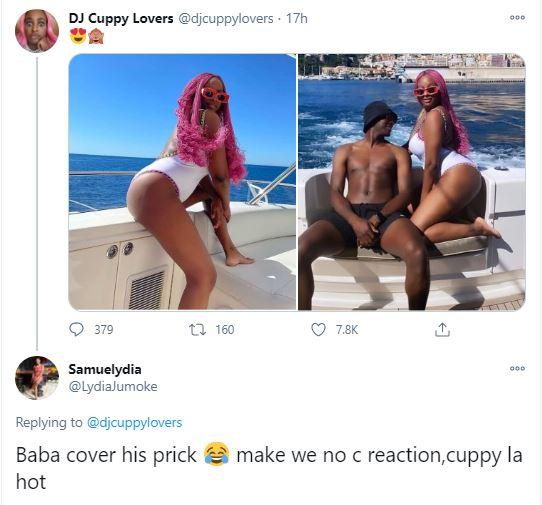 The man in question however has his hands over his manhood while gazing at DJ Cuppy’s bosoms.