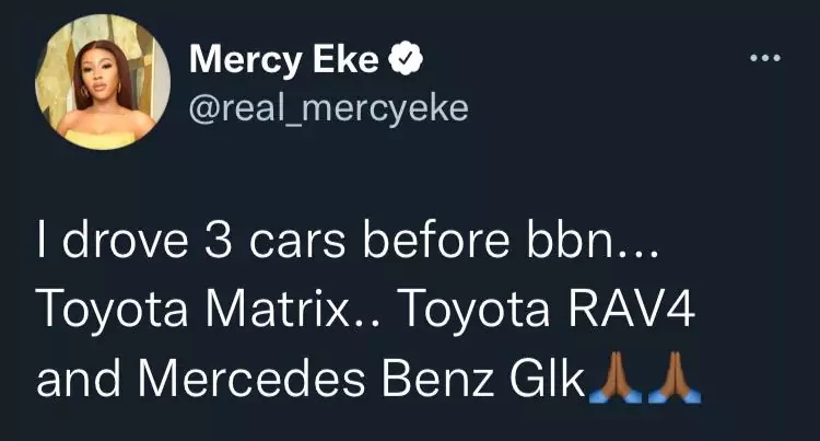 Popular brand influencer, Mercy Eke is under fire over claims of lying on BBNaija reality show after revealing that she had three cars, and a house before participation.