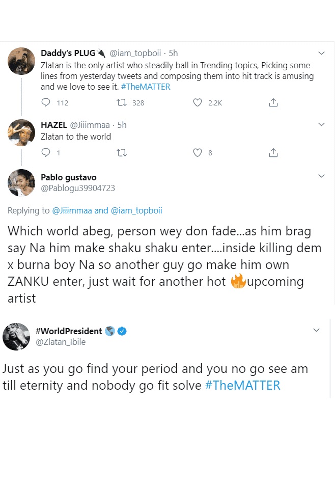 It all began when Zlatan jumped on a trend #TheMatter on Twitter, claiming he is about to release a song about different trending topics in Nigeria.